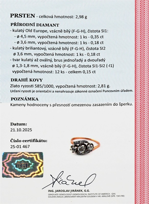 Materiál: žluté zlato o ryzosti 585/1000 Hmotnost: 3,00 g Rozměry: velikost prstenu 50, míry hlavy 1,4x0,9 cm Drahokamy: - 1 ks přírodní kulatý diamant Old Europe, celkem 0,35 ct, vzácně bílý (F-G-H), - 1 ks přírodní kulatý diamant Old Europe, celkem 0,18 ct, vzácně bílý (F-G-H), - 1 ks přírodní kulatý briliantový diamant, celkem 0,18 ct, vzácně bílý (F-G-H), - 12 ks přírodních diamantů, celkem 0,15 ct, kulatý až oválný, vzácně bílý (F-G-H) Stav: výborný Doklady: Osvědčení Puncovního úřadu České republiky Certifikát z gemologické laboratoře je součástí šperku Pro vaše maximální pohodlí nabízíme kompletní zlatnický servis: úpravy velikosti, odborné opravy, rhodiování, výměny kamenů, profesionální čištění, leštění i znalecké odhady. Vše přizpůsobíme vašim přáním.