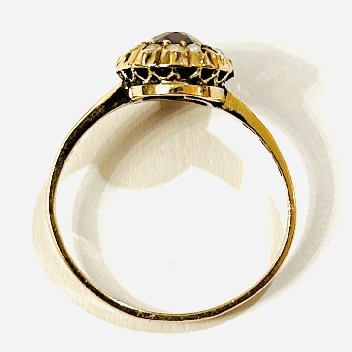 Zlatý starožitný prsten s granátem a perlami