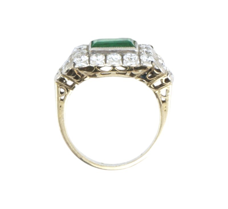 Starožitný prsten z bílého zlata ryzosti 585/1000 je osazen smaragdem bagetového brusu a diamanty celkové hmotnosti cca 1,90 ct. Celková hmotnost šperku je 4,10 g. Velikost 53. Krásná původní zlatnická práce, odborně vyčištěno zlatníkem.