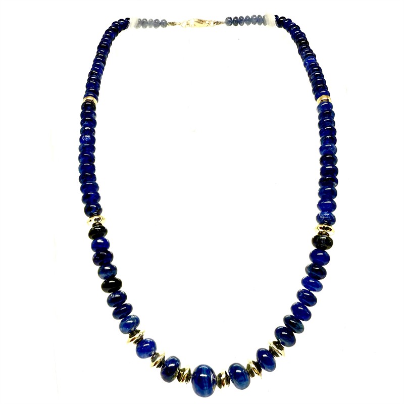 Elegantní tanzanitový náhrdelník zdobený 14ti karátovým zlatem (585/1000). Temně modré tanzanity vysoké kvality se zvětšují směrem ke středu. Zapínání, prodlužovací řetízek a proložení drahokamů - zlato. Celková váha šperku 29,59 g. Délka 42 + 5 cm. Šperk byl profesionálně vylešten a je v perfektním stavu.