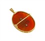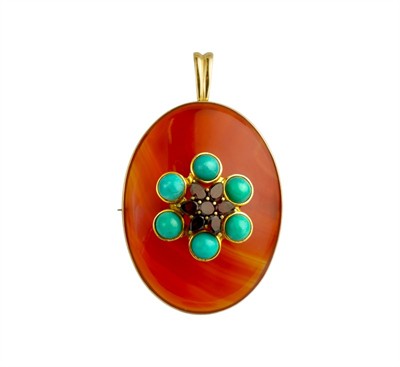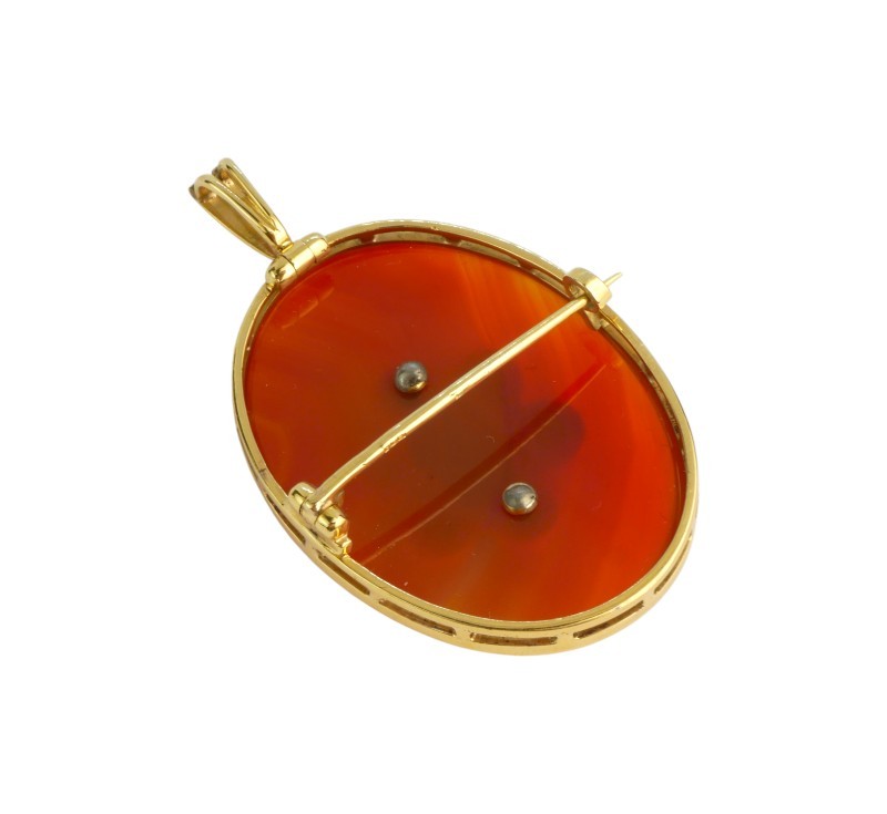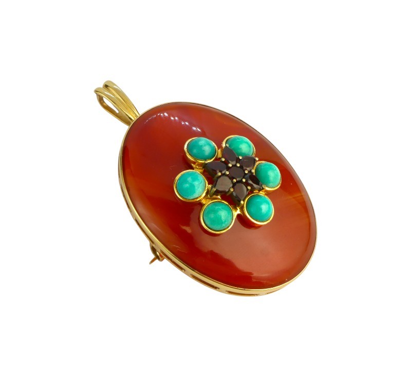 Brož ze žlutého zlata ryzosti 585/1000 zdobí oválný červenohnědý achát s českými granáty a tyrkysy. Rozměr brože 5 x 3 cm, celková hmotnost 14,15 g.