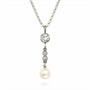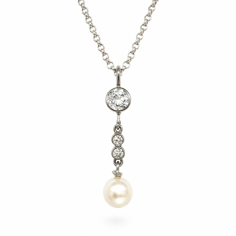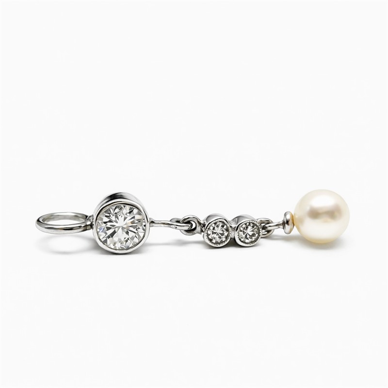 Půvabný závěs z bílého zlata o ryzsoti 14karátů (585/1000). Šperk do cargle zasazený briliant o váze cca 0,35 ct. Kinetický ověs zdobí dva drobnější brilianty a sněhobílá perla o průměru 5 mm. Celková váha 1,24 g. Délka 2,7 cm. Perfektní stav. Řetízek není součástí prodeje.