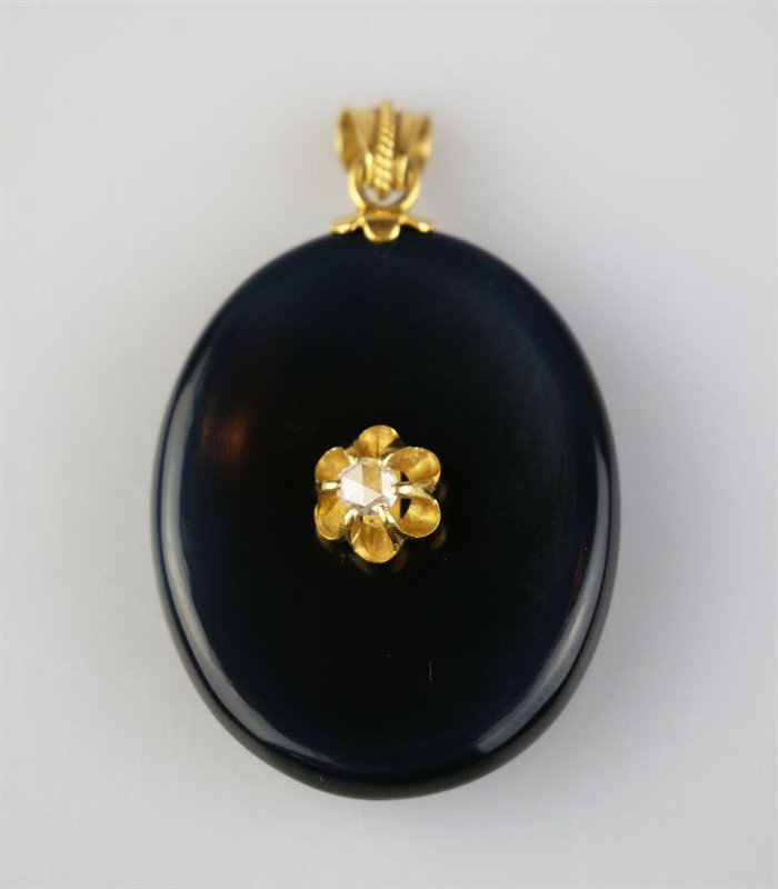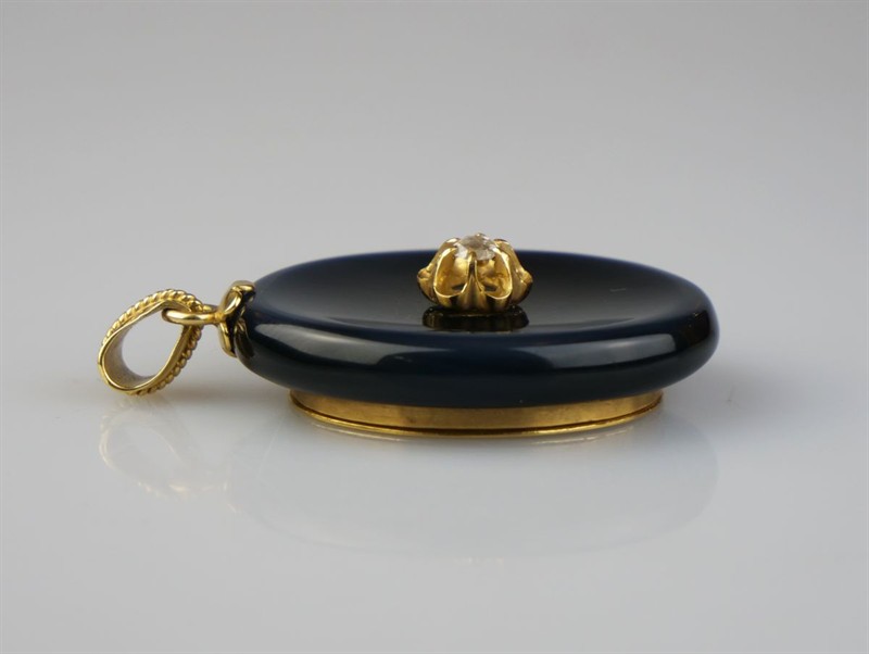 zlatý závěs s broušeným masivním onyxem a diamantovou routou, zadní strana se schránkou se sklíčkem, Au btto 20,91 g/750/1000, západní Evropa, kolem r. 1890, atest Puncovního úřadu; rozměr 5,3 x 3,2 cm
