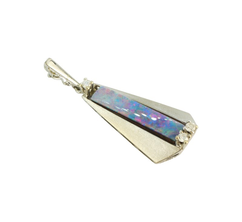 Závěs z bílého zlata ryzosti 585/1000 zdobí opálová destička na onyxu a tři drobné briliantky (celkem 0,10 ct). Rozměry přívěšku 3,9 x 1,5 cm (i s ouškem), celková hmotnost 3,72 g.