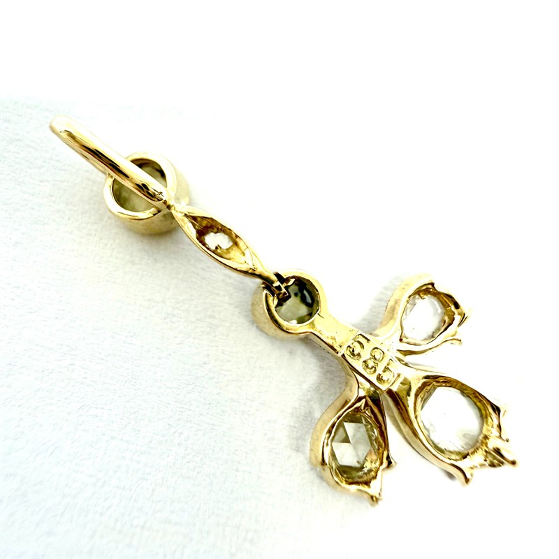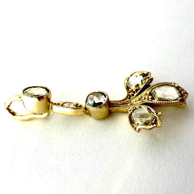 Půvabný, něžný závěs ze 14ti karátového zlata (585/1000) nesoucí nevšední florální motiv. Šperk zdobí pět velkých a jedna drobná diamantová routa. Váha šperku 1,23 g. Délka 2,5 cm. Závěs byl profesionálně vyleštěn a je ve výborném stavu. Řetízek není součástí prodeje.