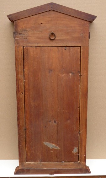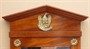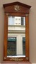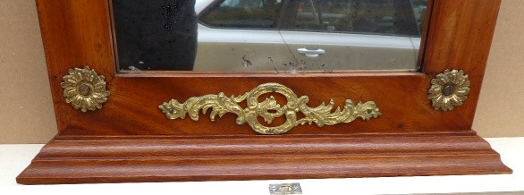 Dřevo, zrcadlo, mosaz. V empírovém stylu. Menší zrcadlo zámeckého typu inspirované empírovým stylem. V horní části trojúhelníkového tympanonu originální mosazná ozdoba s motivem orla s trojlistou ratolestí. Odstupňovaná předsazená římsa. Čtyři originální mosazné ozdobné rozety ve tvaru stylizovaného květu růže. V dolní části rokokový mosazný ornament. Profilovaná spodní lišta. Střední Evropa 1900 - 1930. Rozměr zrcadla: 86 cm x 42 cm x 5,5 cm.